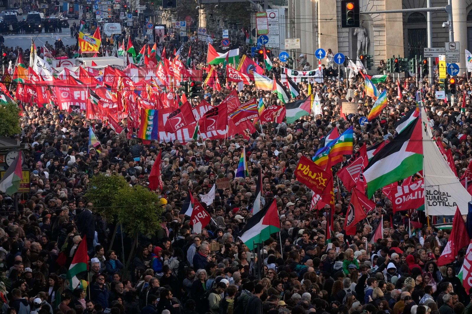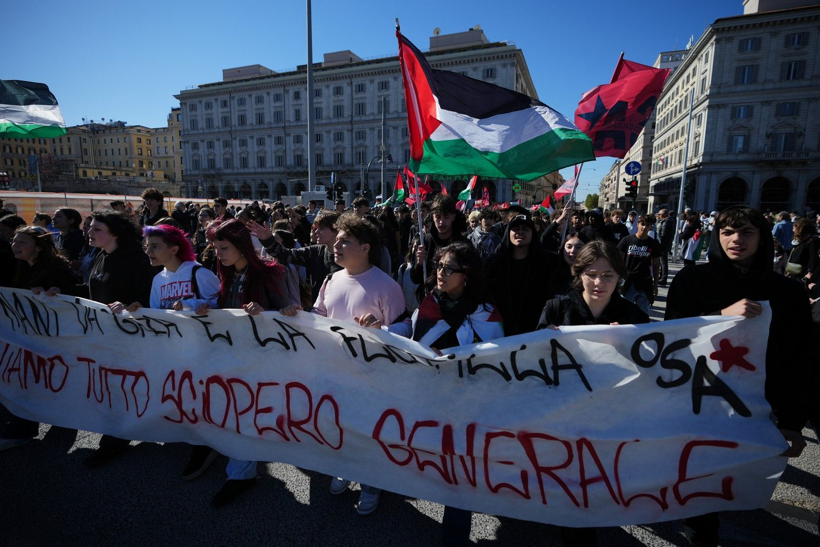 Τους δρόμους των ιταλικών πόλεων κατακλύζουν οι διαδηλωτές στην Ιταλία στο πλαίσιο της γενικής απεργίας των συνδικάτων Cgil και Usb σε συμπαράσταση προς τα μέλη του Global Sumud Flotilla