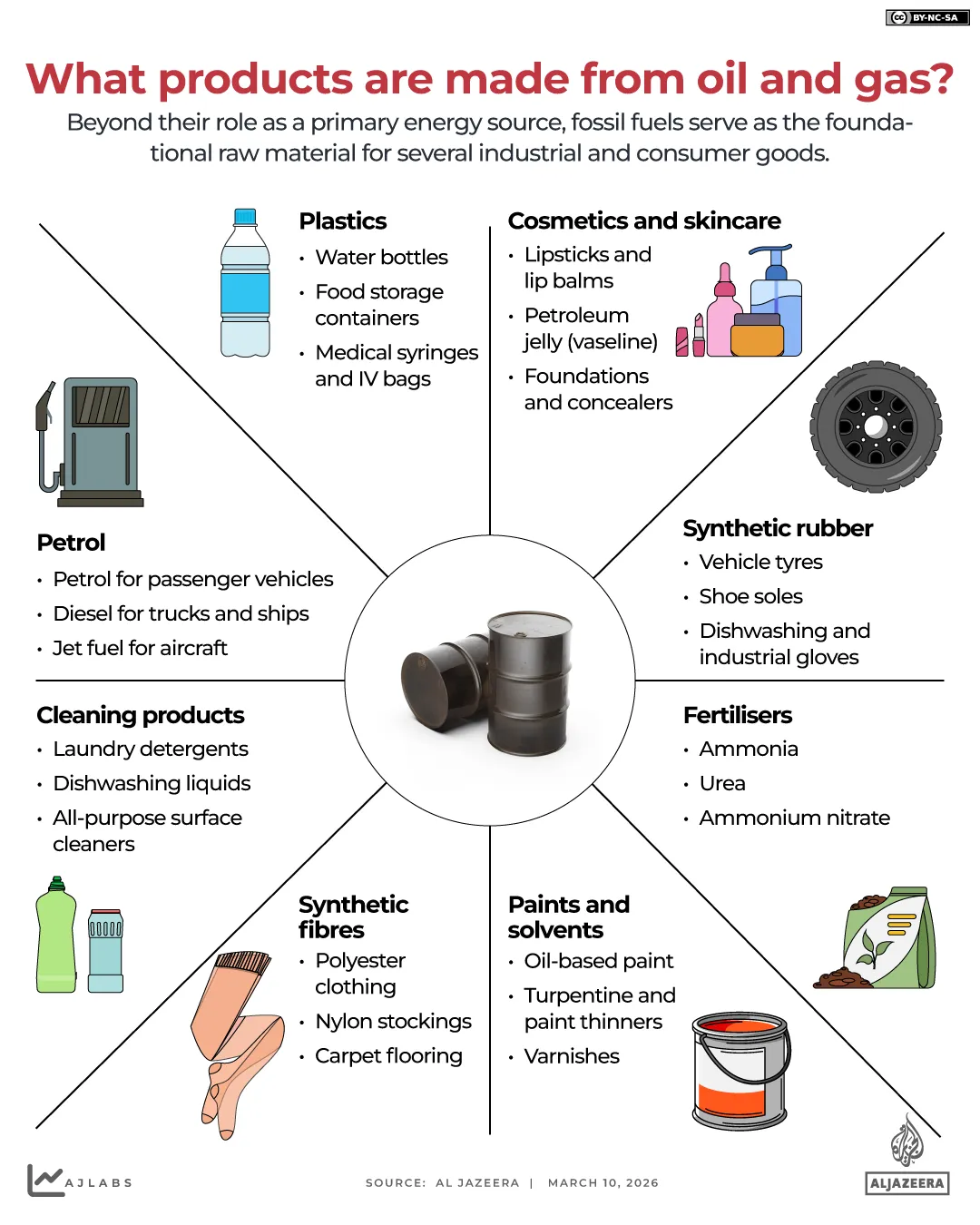 Όπως γράφει το Al Jazeera, τα πλαστικά, όπως τα μπουκάλια νερού, η συσκευασία τροφίμων, τα καπάκια κινητών τηλεφώνων και οι ιατρικές σύριγγες, προέρχονται από αργό πετρέλαιο.