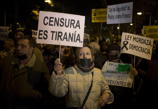 Καρέ από πορεία διαμαρτυρίας κατά της λογοκρισίας των δημοσιογράφων στη Μαδρίτη, Ιανουάριος 2015 AP