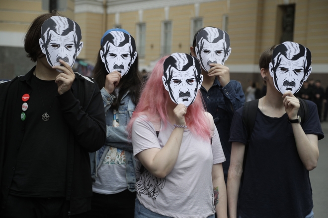 Πορεία κατά της λογοκρισίας στη Ρωσία. Οι διαδηλωτές φοράνε μάσκες εμπνευσμένες από το μυθιστόρημα του Όργουελ 1984 AP