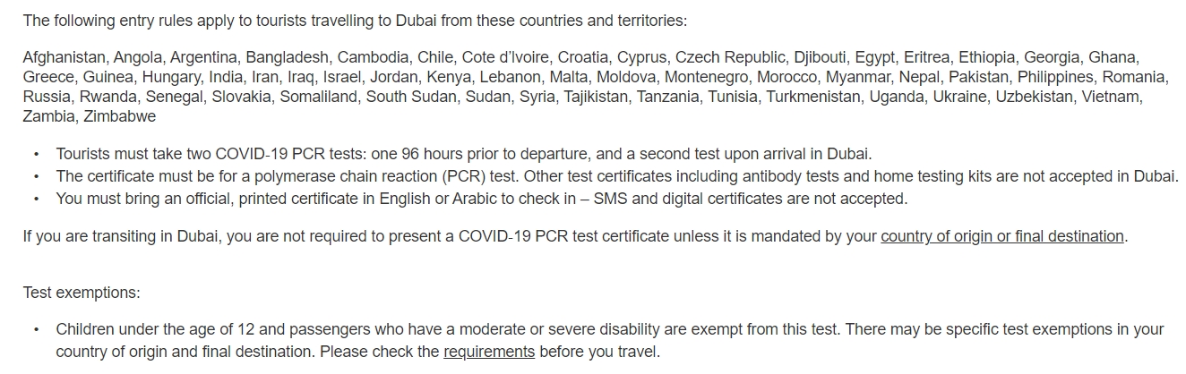 Σύμφωνα με τα μέτρα που έχει λάβει το Ντουμπάι, οι τουρίστες από την Ελλάδα είναι υποχρεωμένοι να κάνουν 2 COVID‑19 PCR test, ένα 96 ώρες πριν την αναχώρησή τους, και ακόμη ένα με την άφιξή τους στο Εμιράτο. Ο επισκέπτης είναι υποχρεωμένος να μείνει στο δωμάτιο του ξενοδοχείου του μέχρι το αποτέλεσμα του δεύτερου τεστ που κάνει στη χώρα.