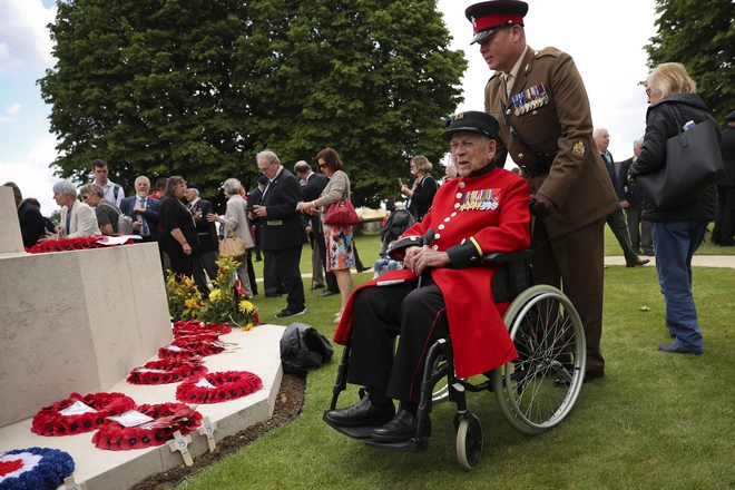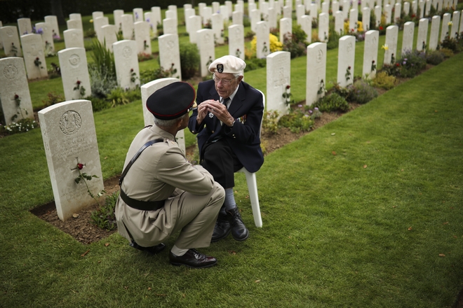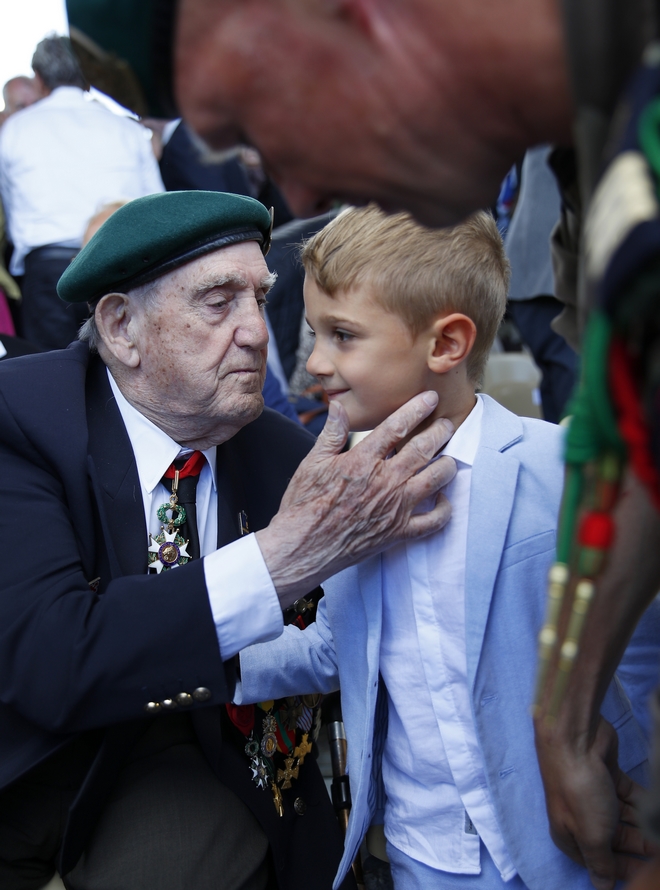 “Γνωρίζουμε τι οφείλουμε σε εσάς τους βετεράνους: την ελευθερία μας. Εκ μέρους της χώρας μου, θέλω μόνο να πω ευχαριστώ”, δήλωσε στα αγγλικά ο πρόεδρος της Γαλλίας Εμανουέλ Μακρόν