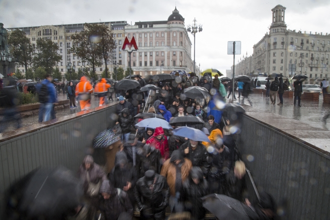 Demonstrators walk down into a subway under heavy rain during a rally in Moscow, Russia, Saturday, Oct. 7, 2017. Supporters of opposition leader Alexei Navalny rallied across Russia on Saturday, heeding his call to pressure authorities into letting him enter the presidential race with a wave of demonstrations on President Vladimir Putin's 65th birthday. (AP Photo/Ivan Sekretarev) AP