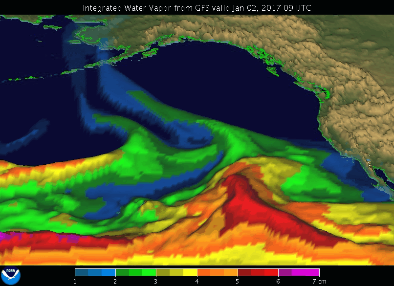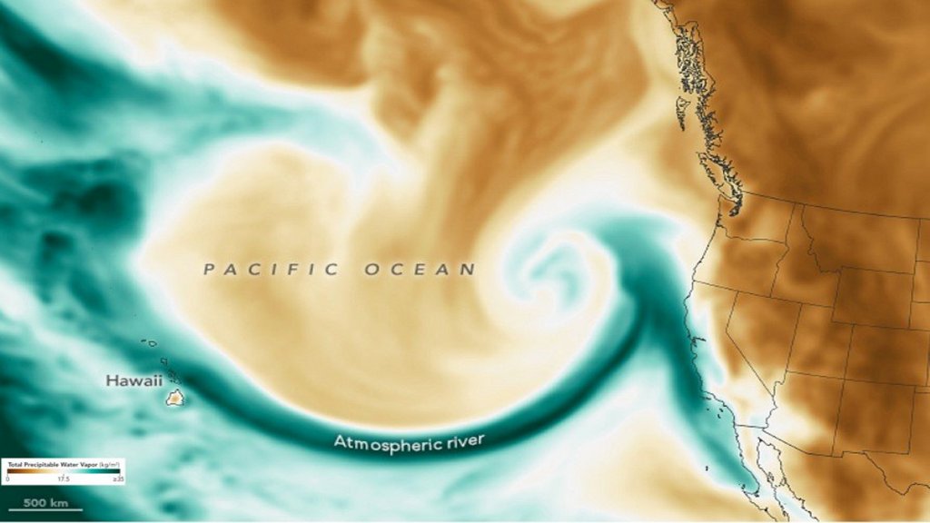 Οι σκούρες πράσινες περιοχές στον παραπάνω χάρτη μας δείχνουν μια στενή ζώνη υγρασίας που ρέει από τον τροπικό Ειρηνικό προς τη Δυτική Ακτή. Η εικόνα προήλθε από το Σύστημα Παρατήρησης Γης Goddard της NASA, Atmospheric Data Assimilation System (GEOS ADAS), το οποίο χρησιμοποιεί δορυφορικά δεδομένα και μοντέλα φυσικών διεργασιών για να υπολογίσει τι συμβαίνει στην ατμόσφαιρα. Οι ατμοσφαιρικοί ποταμοί αποτελούνται από στενές ζώνες ενισχυμένης μεταφοράς υδρατμών, συνήθως κατά μήκος των ορίων μεταξύ μεγάλων περιοχών αποκλίνουσας επιφανειακής ροής αέρα, συμπεριλαμβανομένων ορισμένων μετωπικών ζωνών σε συνδυασμό με εξωτροπικούς κυκλώνες που σχηματίζονται πάνω από τους ωκεανούς.