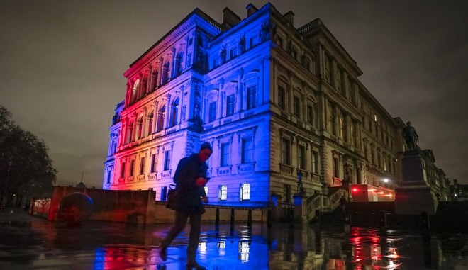 Άνδρας έξω από το φωταγωγημένο για την περίσταση υπουργείο Εξωτερικών της Μεγάλης Βρετανίας AP