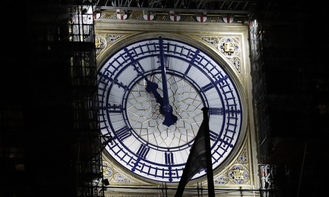 Στους λευκούς βράχους του Ντόβερ προβαλλόταν το μήνυμα: «Το Ηνωμένο Βασίλειο αποχώρησε από την ΕΕ» ανάμεσα σε μία βρετανική και μία ευρωπαϊκή σημαία.