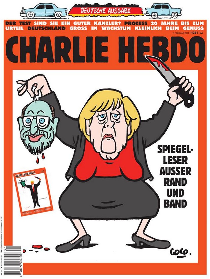 “Εκτός ελέγχου οι αναγνώστες του Spiegel” σημειώνεται στο πρωτοσέλιδο του Charlie Hebdo, στο οποίο η Άνγκελα Μέρκελ κραδαίνει ματωμένο  μαχαίρι στο ένα χέρι και το κεφάλι του σοσιαλδημοκράτη Μάρτιν Σουλτς στο άλλο. Η γερμανική έκδοση του σατιρικού περιοδικού κάνει σαφή αναφορά στις πρόσφατες δημοσκοπήσεις που θέλουν τον πρώην πρόεδρο του ευρωκοινοβουλίου να πλησιάζει – και σε μία περίπτωση να περνά μπροστά από – την Γερμανίδα Καγκελάριο. Παράλληλα, στο πρωτοσέλιδο διακρίνεται σε μικρογραφία εκείνο του Spiegel, στο οποίο ο Ντόναλντ Τραμπ με τον ίδιο τρόπο και θυμίζοντας Τζιχαντιστή αποκεφάλιζε το άγαλμα της Ελευθερίας.