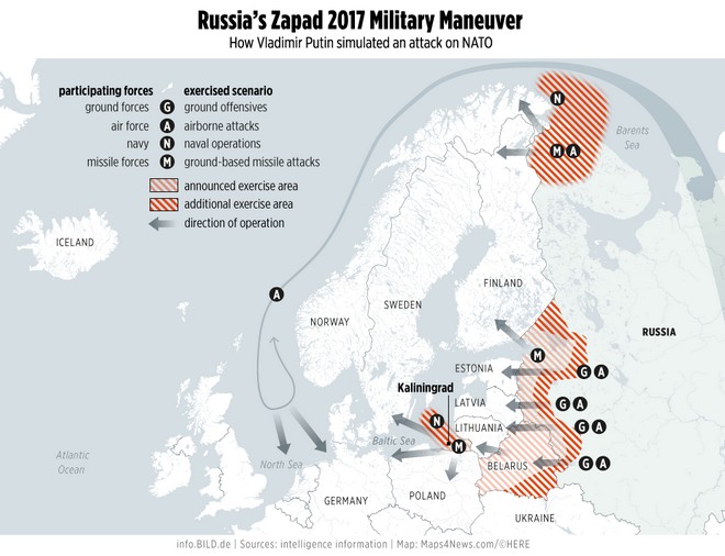 Στην άσκηση Zapad περιλαμβάνεται βομβαρδισμός της Γερμανίας και εισβολή στα κράτη της Βαλτικής. Οι ασκήσεις πραγματοποιήθηκαν τις προηγούμενες ημέρες κάτω από το βλέμμα του Βλαδίμηρου Πούτιν. Η άσκηση ετοιμότητας περιλαμβάνει επίθεση και εναντίον της Πολωνίας, της Ολλανδίας καθώς και απόβαση στα Σκανδιναβικά κράτη.