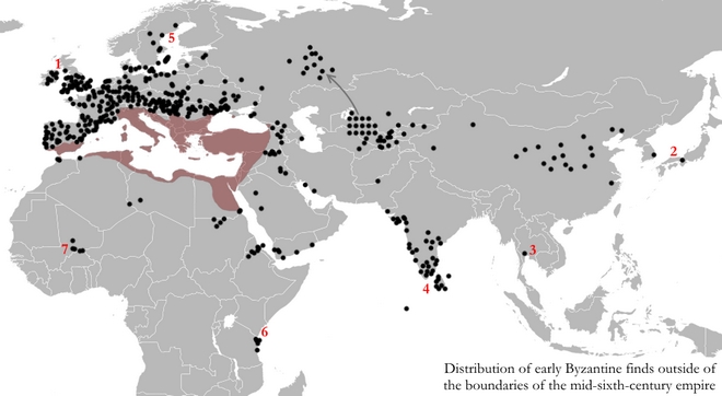 Η καθηγήτρια Ιστορίας του πανεπιστημίου του Cambridge Dr Caitlin Green δημοσίευσε στο προσωπικό της ιστολόγιο έναν χάρτη που απεικονίζει τη παγκόσμια γεωγραφική διασπορά απομιμήσεων βυζαντινής τεχνοτροπίας και βυζαντινών αντικειμένων, που χρονολογούνται στον πέμπτο αιώνα μ.Χ.