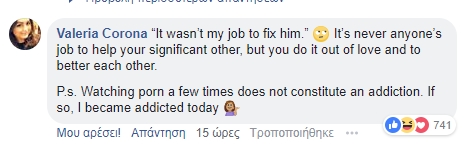 Όπως δηλώνει, το πρόβλημα δεν ήταν ότι ο σύντροφός της έβλεπε πορνό, αλλά ότι της έκρυβε τη συνήθειά του. “Ζούσα με έναν άγνωστο και όχι με εκείνον που νόμιζα πως ήξερα. Δεν θα μπορούσα να συνεχίσω να τον αντικρίζω σκεπτόμενη ότι μπορεί να μου κρύβει κι άλλα πράγματα. Ήθελα μόνο μια ειλικρινή σχέση”, γράφει η 21χρονη.