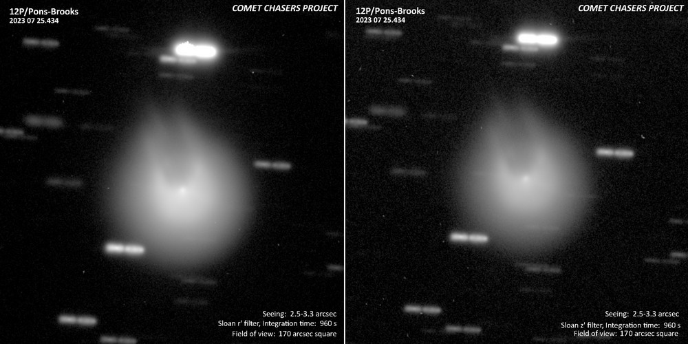 Οι αστρονόμοι που εντόπισαν το “ασυνήθιστο φαινόμενο”, σοκαρίστηκαν όταν είδαν τη φωτεινότητα να γίνεται 100 φορές μεγαλύτερη ξαφνικά, πριν καταλήξουν στο συμπέρασμα ότι επρόκειτο για το αποτέλεσμα της απελευθέρωσης αερίων νεφών γύρω από τον 12P/Pons-Brooks.