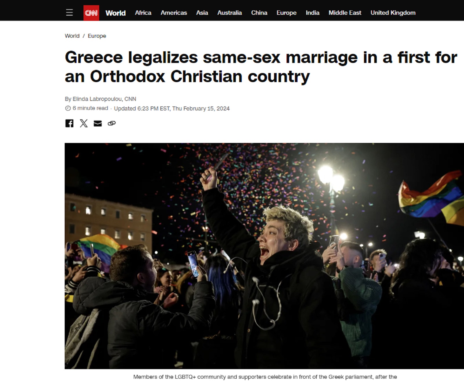 “Τα ομόφυλα ζευγάρια θα μπορούν πλέον να υιοθετούν παιδιά μετά την ψηφοφορία της Πέμπτης. Ο Έλληνας Πρωθυπουργός Κυριάκος Μητσοτάκης είπε ότι ο νέος νόμος “θα καταργήσει με τόλμη μια σοβαρή ανισότητα”», τονίζει το CNN. «Όμως η νομοθεσία έχει διχάσει τη χώρα, με τη σφοδρή αντίσταση να ηγείται της πανίσχυρης Ελληνικής Ορθόδοξης Εκκλησίας», προσθέτει.