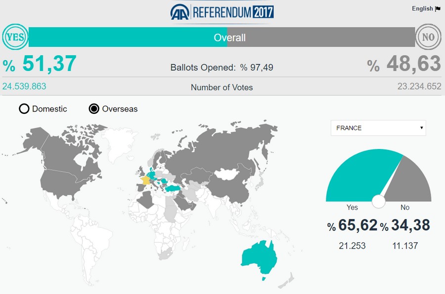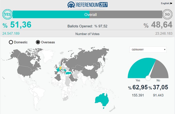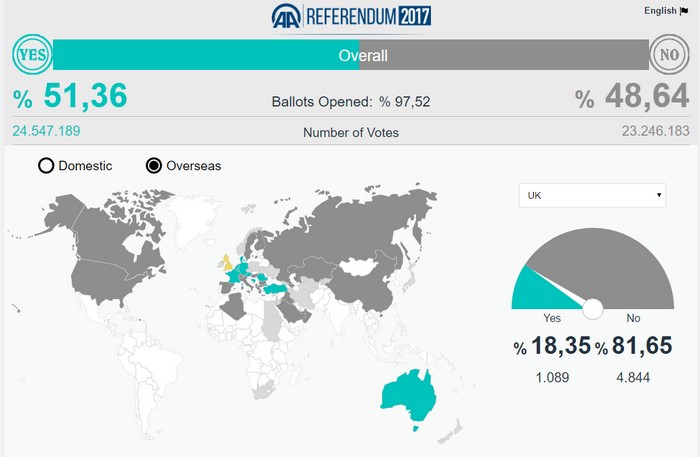 Υπέρ της διεύρυνσης των εξουσιών του Τούρκου προέδρου ψήφισαν οι Τούρκοι πολίτες της Γερμανίας και της Γαλλίας ενώ εναντίον της συνταγματικής αναθεώρησης (με ποσοστό 81,65%) τάχθηκαν οι απόδημοι Τούρκοι του Ηνωμένου Βασιλείου.