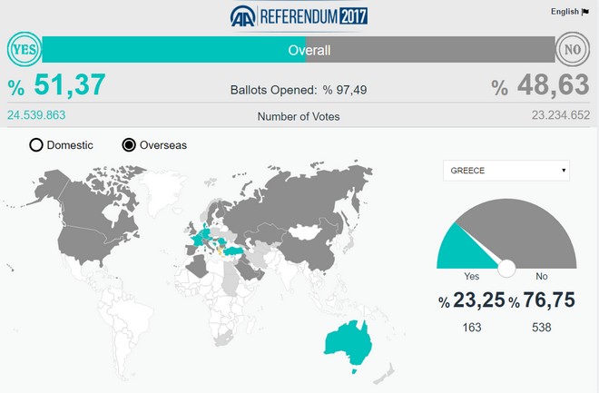 Κατά της συνταγματικής αναθεώρησης που διευρύνει τις εξουσίες του Τούρκου προέδρου Ρετζέπ Ταγίπ Ερντογάν ψήφισε η πλειοψηφία των απόδημων Τούρκων στην Ελλάδα.