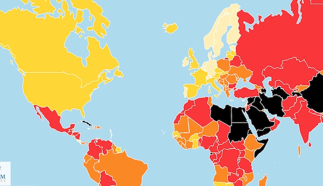 Χάρτης που απεικονίζει την ελευθερία του τύπου σύμφωνα με τα στοιχεία των Δημοσιογράφων Χωρίς Σύνορα screenshot rsf.org