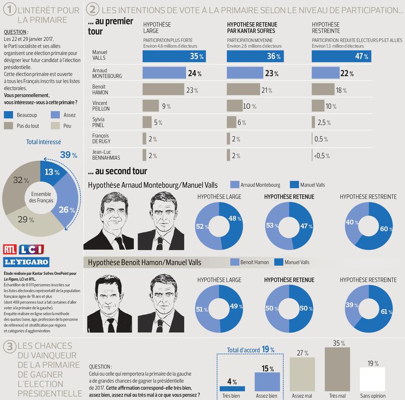 Στην υπόθεση πρόκρισης στη δεύτερη Κυριακή, του σοσιαλιστή βουλευτή και συμβούλου στο δήμο Παρισιού Μπενουά Αμόν, η δημοσκόπηση δίνει την απόλυτη ισοπαλία 50 – 50%. Ενδιαφέρον παρουσιάζει σε όλα τα υποθετικά σενάρια, πως, όσο υψηλότερη είναι η συμμετοχή, τόσο λιγότερες οι πιθανότητες του Βαλς να επικρατήσει των αντιπάλων του. Με άλλα λόγια, αν στους προκριματικούς προσέλθουν πολίτες από πιο ευρεία γκάμα πολιτικών πεποιθήσεων και όχι φανατικοί σοσιαλιστές, ο πρώην πρωθυπουργός θα δυσκολευτεί ιδιαίτερα να πάρει το χρίσμα. Αντίθετα, αν η προσέλευση είναι χαμηλή, τότε μοιάζει ως ο αδιαμφισβήτητος νικητής.
