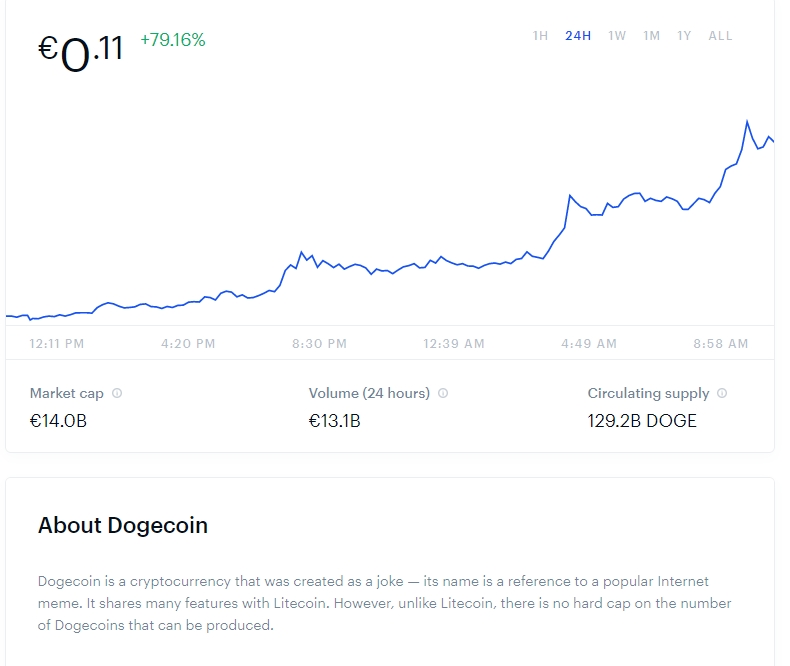 Στα 13 σεντς σε σχέση με το δολάριο εκτοξεύτηκε η αξία του Dogecoin, το κρυπτονόμισμα που ξεκίνησε από memes στα social media.