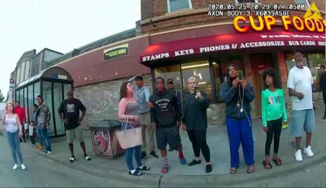 Εικόνα από κάμερα αστυνομικού δείχνει την Darnella Frazier, τρίτη από τα δεξιά να βιντεοσκοπεί την δολοφονία του Τζορτζ Φλόιντ από τον πρώην αστυνομικό, Ντέρεκ Τσάββιν, 25 Μαΐου 2020 Αστυνομικό Τμήμα της Μινεάπολης μέσω AP