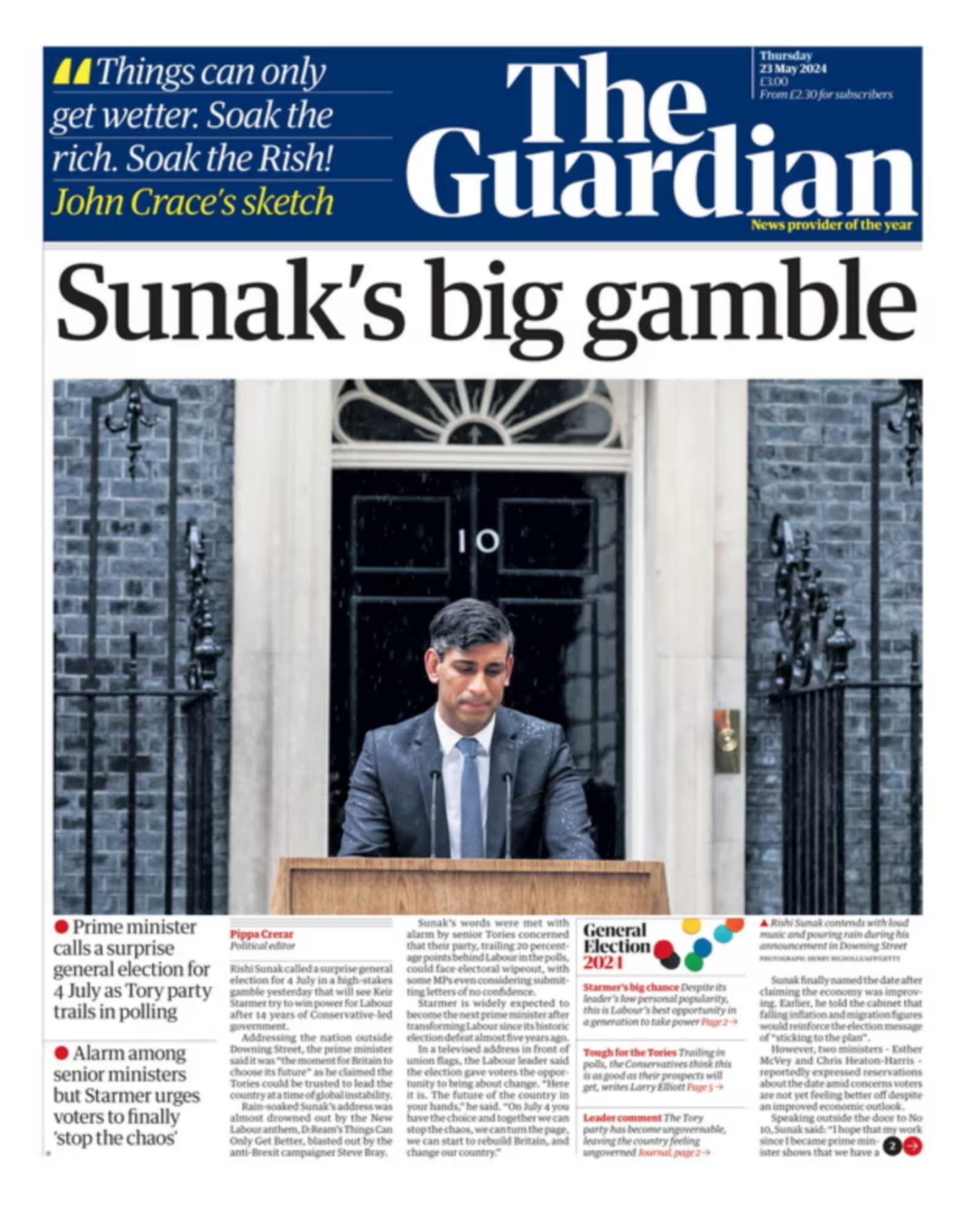 Η απόφαση του Ρίσι Σουνάκ να προκηρύξει αιφνιδιαστικά γενικές εκλογές για τις 4 Ιουλίου κυριαρχεί στα πρωτοσέλιδα των βρετανικών εφημερίδων, σήμερα, Πέμπτη (23/5), με κεντρική εικόνα, στις περισσότερες περιπτώσεις, το διάγγελμα του πρωθυπουργού στην Downing Street, υπό σφοδρή βροχόπτωση.