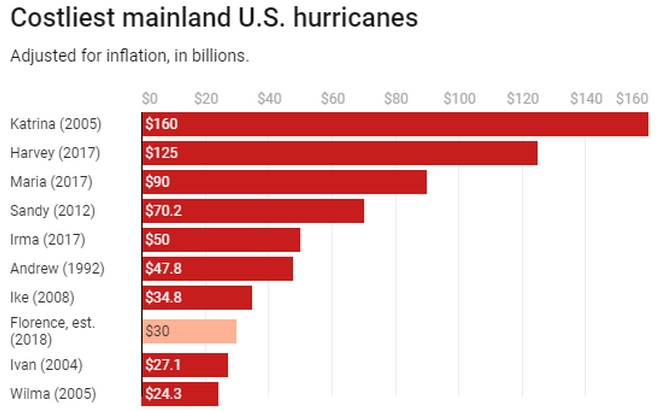 Στη λίστα πρώτη θέση ως προς το καταστροφικό του έργο έχει ο τυφώνας Κατρίνα, ο οποίος προξένησε ζημιές ύψους 160 εκατ. δολαρίων. Ο Φλόρενς είναι στην 8η θέση, με εκτιμώμενες ζημιές ύψους 30 εκατ. δολαρίων.
