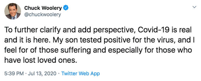 “Ο γιος μου έχει βρεθεί θετικός στον ιό και συμπάσχω με εκείνους που υποφέρουν και ειδικά με εκείνους που έχουν χάσει τους αγαπημένους τους”, έγραψε ο πρώην παρουσιαστής σε tweet που δημοσιεύτηκε τη Δευτέρα το απόγευμα. Λίγο αργότερα, ο ίδιος απενεργοποίησε εντελώς τον λογαριασμό του στο Twitter.