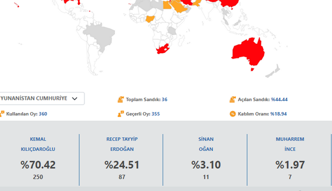 Σύμφωνα με τα στοιχεία που δίνει το κρατικό πρακτορείο ειδήσεων Anadolu, οι Τούρκοι πολίτες που άσκησαν το εκλογικό δικαίωμά τους στην Ελλάδα, και με καταμετρημένο το 85% των ψήφων, επέλεξαν τον Κεμάλ Κιλιτσντάρογλου.