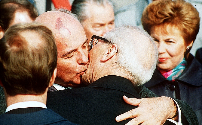 Φιλί του τελευταίου Σοβιετικού ηγέτη Μιχαήλ Γκορμπατσόφ στον τελευταίο ηγέτη της Ανατολικής Γερμανίας Ερικ Χόνεκερ ASSOCIATED PRESS