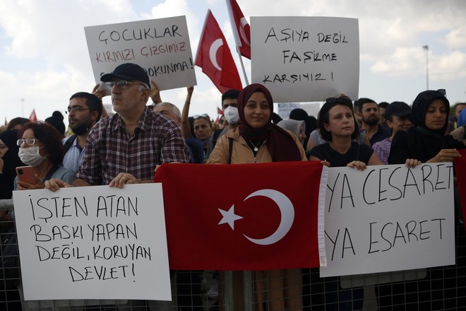 Τούρκοι διαδηλωτές κατά του εμβολιασμού και των υποχρεωτικών μέτρων 2021 Mehmet Guzel/AP Photo