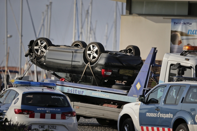 An overturned car is transported on a platform from the spot where terrorists were intercepted by police in Cambrils, Spain, Friday, Aug. 18, 2017. The police force for Spain's Catalonia region says the five suspects shot and killed in the resort town of Cambrils were carrying bomb belts, which have been detonated by the force's bomb squad. (AP Photo/Emilio Morenatti) AP