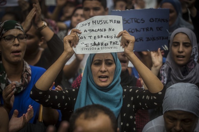 (“Είμαι μουσουλμάνα και Καταλανή, όχι τρομοκράτης. Το Ισλάμ είναι ειρήνη”, γράφει το χαρτί. AP Photo/Santi Palacios)