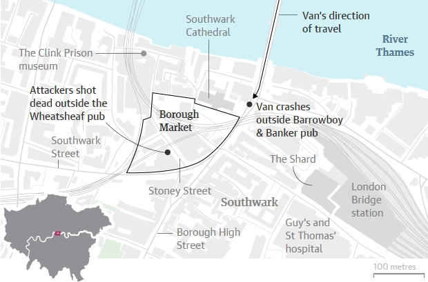 Εν τω μεταξύ η Express έδωσε στη δημοσιότητα βίντεο που απέστειλε αναγνώστης, στο οποίο απεικονίζονται οι δράστες να εισέρχονται με ηρεμία στην Μπόροου Μάρκετ για να συνεχίσουν με το δεύτερο “σκέλος” της επίθεσης τους. Η Μητροπολιτική Αστυνομία του Λονδίνου επενέβη μέσα σε οκτώ λεπτά από τη στιγμή που εκλήθη.