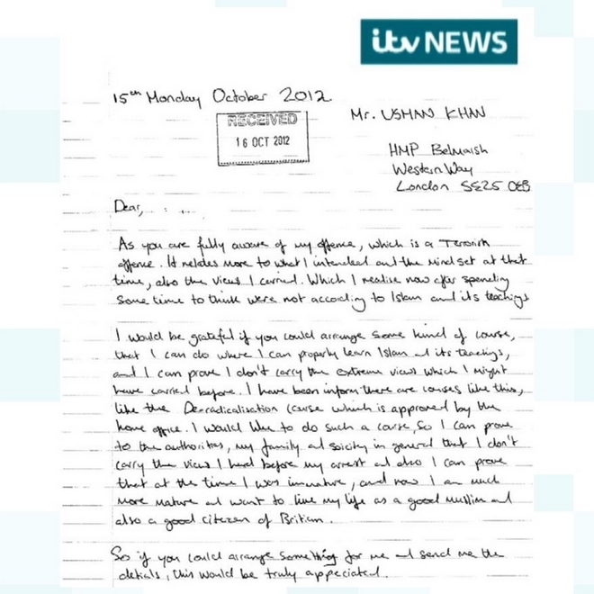 Μία επιστολή του ένοπλου δράστη, Ουσμάν Καν, που πραγματοποίησε την Παρασκευή την επίθεση στη Γέφυρα του Λονδίνου, από την οποία σκοτώθηκε ο ίδιος και δύο πολίτες, ενώ τραυματίστηκαν άλλοι τρεις, παρουσίασε το Σάββατο το δελτίο ειδήσεων του ITV, σύμφωνα με την οποία ζητούσε να συμμετάσχει σε μαθήματα που θα βοηθούσαν στην «αποριζοσπαστικοποίησή του» από το Ισλάμ.