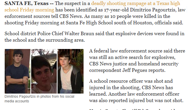 Ο 17 χρονος Δημήτριος Παγουρτζής, ελληνικής καταγωγής, φέρεται ως ο δράστης της επίθεσης στο Λύκειο της Σαντα Φε , στο Τέξας, όπου έχασαν τη ζωή τους τουλάχιστον 10 άνθρωποι. Την πληροφορία μεταδίδει το αμερικανικό δίκτυο CBS, όπως βλέπετε στο απόσπασμα του δημοσιεύματος. Στην πλειονότητά τους τα θύματα είναι μαθητές.
