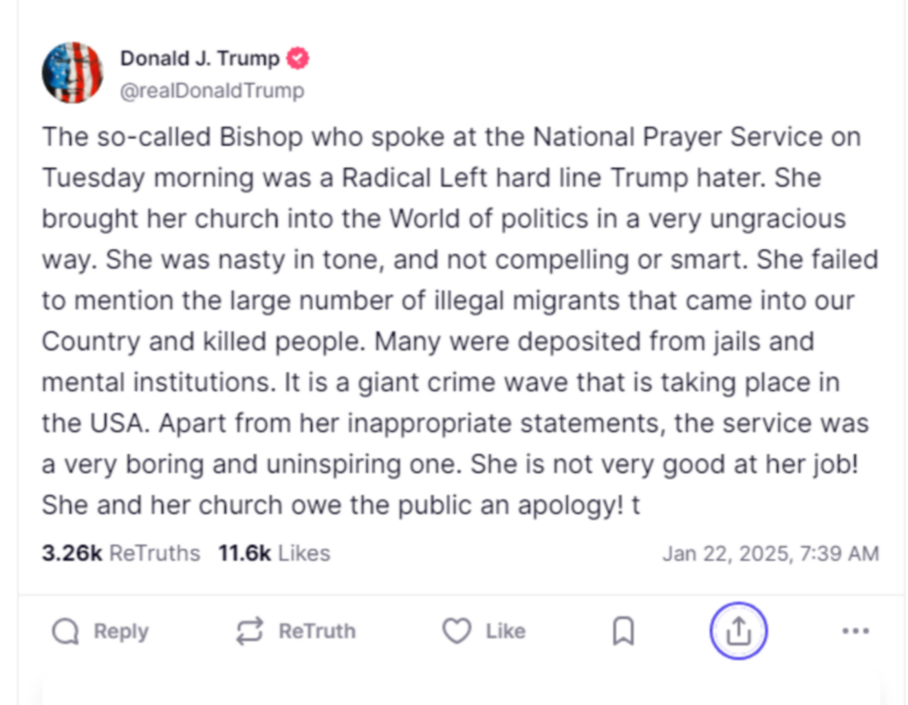 “Η αποκαλούμενη Επίσκοπος που μίλησε στην Εθνική Τελετή Προσευχής το πρωί της Τρίτης ήταν μια σκληροπυρηνική αριστερή, που μισεί τον Τραμπ. Έφερε την εκκλησία της στον κόσμο της πολιτικής με έναν εξαιρετικά αγενή τρόπο. Ήταν εχθρική στον τόνο της, καθόλου πειστική και όχι έξυπνη.