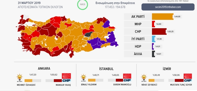 Στη Άγκυρα, κόβει το νήμα ο υποψήφιος του Ρεπουμπλικανικού κόμματος Μανσούρ Γιαβάς με 50,3 έναντι 47,45 του Μεχμέτ Οζχασεκί του Κόμματος Δικαιοσύνης και Ανάπτυξης.