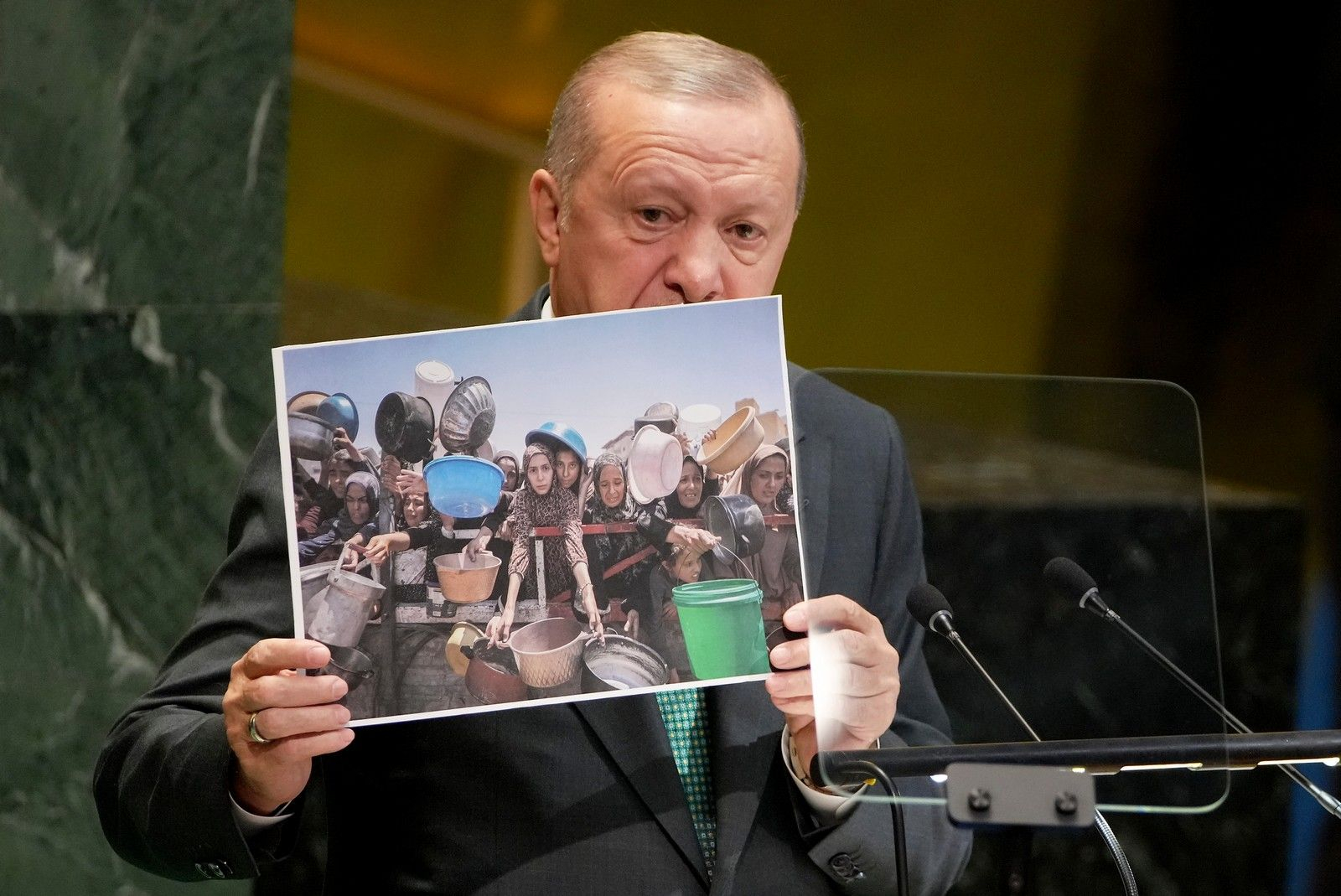 Στη συνέχεια της ομιλίας του, ο Ερντογάν προέβαλε εικόνες της καθημερινής ζωής στη Γάζα, που απεικονίζει πεινασμένες γυναίκες που κρατούν κουβάδες και κατσαρόλες περιμένοντας για λίγη τροφή.