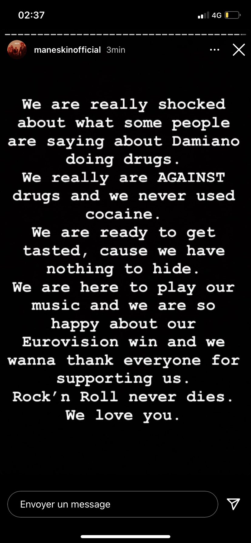 “Είμαστε σοκαρισμένοι για το τι λένε ορισμένοι άνθρωποι για τον Damiano ότι έκανε ναρκωτικά. Είμαστε πραγματικά κατά των ναρκωτικών και δεν έχουμε κάνει ποτε χρήση κοκαΐνης. Είμαστε έτοιμοι να κάνουμε τεστ γιατί δεν έχουμε τίποτα να κρύψουμε. Είμαστε εδώ για να παίξουμε μουσική και είμαστε πολύ χαρούμενοι για τη νίκη μας στη Eurovision και ευχαριστούμε όσους μας στήριξαν. Το Rock & Roll δεν θα πεθάνει ποτέ. Σας αγαπάμε”, έγραψαν.