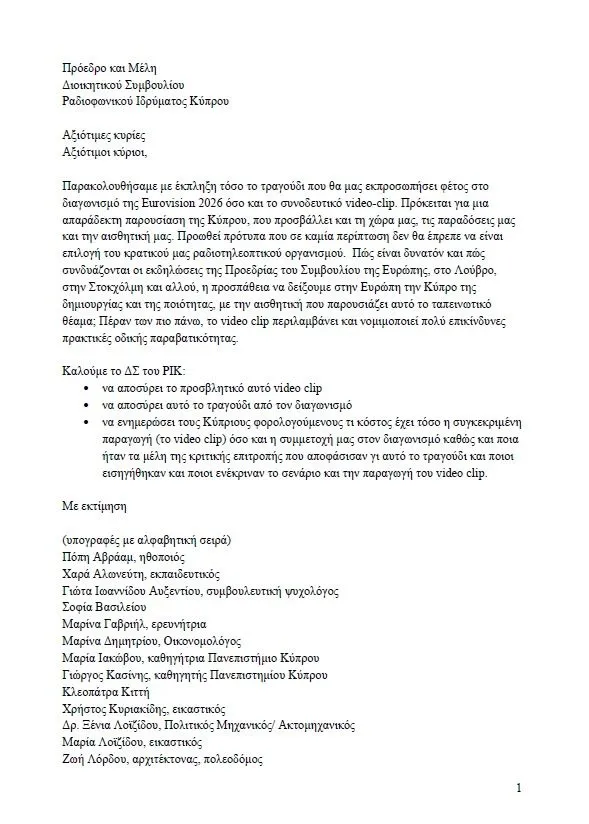 Στην επιστολή, οι υπογράφοντες αναφέρουν ότι παρακολούθησαν με έκπληξη τόσο το τραγούδι όσο και το video clip, κάνοντας λόγο για μια «απαράδεκτη παρουσίαση της Κύπρου», η οποία όπως σημειώνουν–προσβάλλει την ιστορία, τις παραδόσεις και την αισθητική του τόπου.