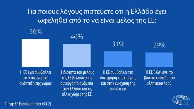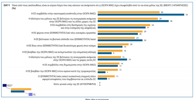 Σύμφωνα με τους ερωτηθέντες στην Ελλάδα, το μεγαλύτερο όφελος από τη συμμετοχή της χώρας στην ΕΕ είναι η συμβολή της στην οικονομική ανάπτυξη της Ελλάδας (56%). Κατά δεύτερο λόγο, οι Έλληνες αξιολογούν ως επωφελή την ιδιότητα τους μέλους της ΕΕ γιατί βελτιώνει τη συνεργασία ανάμεσα στην Ελλάδα και τις άλλες χώρες της ΕΕ (46%) και στην τρίτη θέση τοποθετείται η διατήρηση της ειρήνης και η ενίσχυση της ασφάλειας (31%).
