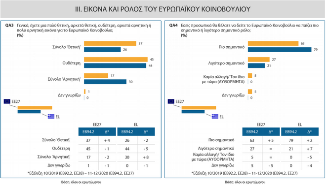 Η πανδημία και άλλες παγκόσμιες προκλήσεις, όπως η κλιματική κρίση, ενδυναμώνουν το αίτημα των πολιτών για θεμελιώδη μεταρρύθμιση της ΕΕ. Το 63% των ερωτηθέντων θέλει το Ευρωπαϊκό Κοινοβούλιο να διαδραματίσει σημαντικότερο ρόλο στο μέλλον. Ακόμα υψηλότερο το ποσοστό για την Ελλάδα, αγγίζει το 79%. Παράλληλα οι φωνές που ζητούν αλλαγές αυξάνονται. Μόνο το 27% υποστηρίζει την ΕΕ όπως ακριβώς έχει πραγματωθεί έως τώρα – το ποσοστό στην Ελλάδα κατεβαίνει στο 13%. Το 44% των Ευρωπαίων και 43% των Ελλήνων δηλώνει πως «μάλλον υποστηρίζει την ΕΕ» αλλά επιθυμεί να δει μεταρρυθμίσεις.