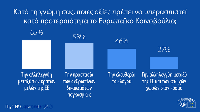 Μεταβολή εμφανίζεται και ως προς στις απαντήσεις των πολιτών όσον αφορά στην κατάταξη των βασικών αξιών που πρέπει να υπερασπιστεί το Ευρωπαϊκό Κοινοβούλιο. Ενώ η προστασία των ανθρωπίνων δικαιωμάτων παγκοσμίως (51%) και η ισότητα μεταξύ ανδρών και γυναικών (42%) παραμένουν στην κορυφή, η αλληλεγγύη μεταξύ των κρατών μελών βρίσκεται στην τρίτη θέση με 41%, σε σύγκριση με 33% πριν από έναν χρόνο. Στην Ελλάδα, η αλληλεγγύη μεταξύ των κρατών μελών της ΕΕ καταλαμβάνει την πρώτη θέση (65%) με δεύτερη την προστασία των ανθρωπίνων δικαιωμάτων παγκοσμίως (58%) και τρίτη την ελευθερία του λόγου (46%).