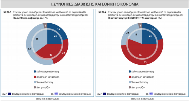 Αντίθετη άποψη έχει μόλις ένας στους τέσσερις Έλληνες και ένας στους πέντε Ευρωπαίους. Ίδια παραμένουν τα ποσοστά σε Ελλάδα και Ευρώπη για όσους αναμένουν βελτίωση των ατομικών συνθηκών διαβίωσής τους. Αντίστοιχα, το 40% των Ελλήνων πολιτών πιστεύει ότι θα ζει χειρότερα σε έναν χρόνο, ποσοστό αισθητά υψηλότερο από τον ευρωπαϊκό μέσο όρο (24%).