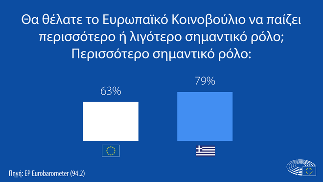 Σημαντικότερο ρόλο για το ευρωκοινοβούλιο ζητά η συντριπτική πλειοψηφία των Ελλήνων σύμφωνα με την έρευνα του Ευρωπαϊκού Κοινοβουλίου. Ενισχυμένη η θετική άποψη των πολιτών για την ΕΕ, ενώ υψηλές είναι οι προσδοκίες από το Σχέδιο Ανάκαμψης από την πανδημία
