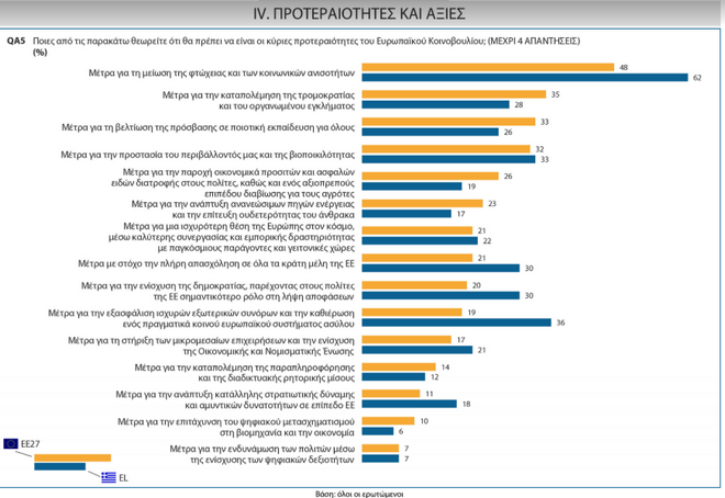 Κατά μέσο όρο στην ΕΕ, ακολουθούν τα μέτρα για τη διασφάλιση ποιοτικής εκπαίδευσης για όλους (33%), καθώς και για την προστασία του περιβάλλοντός μας (32%). Στην Ελλάδα στη δεύτερη θέση βρίσκονται τα μέτρα για την εξασφάλιση ισχυρών εξωτερικών συνόρων και την καθιέρωση ενός πραγματικά κοινού ευρωπαϊκού συστήματος ασύλου (36%) ενώ ακολουθεί η προστασία του περιβάλλοντος με 33%.