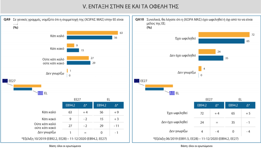 Στο υψηλότερο επίπεδο από το 2007 (63%) βρίσκεται το ποσοστό των πολιτών που θεωρούν θετική την ένταξη της χώρας τους στην ΕΕ. Χαμηλότερο στην Ελλάδα (56%) το αντίστοιχο ποσοστό, ωστόσο σημαντικά αυξημένο σε σχέση με την προηγούμενη αντίστοιχη δημοσκόπηση, κατά 9 ποσοστιαίες μονάδες. Το 72% των Ευρωπαίων δηλώνουν ότι η χώρα τους έχει πραγματικά ωφεληθεί από την ένταξη στην ΕΕ, ενώ στην Ελλάδα καταγράφεται ποσοστό 65%, αυξημένο κατά πέντε ποσοστίες μονάδες από τον Ιούνιο του 2019.