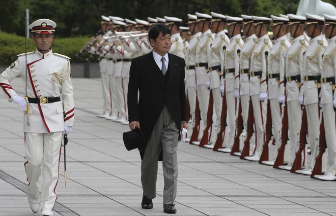 Japan's new Defense Minister Itsunori Onodera inspects an honor guard during a welcome ceremony at the Defense Ministry in Tokyo, Friday, Aug. 4, 2017. (AP Photo/Koji Sasahara) AP