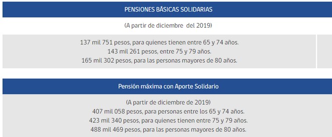 Στις συντάξεις, το σύστημα απόδοσης των οποίων είναι καθαρά ιδιωτικό και διατηρείται σχεδόν ατόφιο από την εποχή Πινοτσέτ, τα πράγματα είναι ακόμα χειρότερα. Για τις ηλικίες 65-74 η βασική-μίνιμουμ σύνταξη ανέρχεται στα 152 ευρώ και η μάξιμουμ στα 452. Για τις ηλικίες από 75 μέχρι 79 τα αντίστοιχα ποσά για μίνιμουμ και μάξιμουμ σύνταξη διαμορφώνονται στα 159 και στα 470 ευρώ. Τέλος, για όσους είναι από 80 ετών και άνω η μίνιμουμ σύνταξη ανέρχεται στα 183 ευρώ και η μάξιμουμ στα 542.