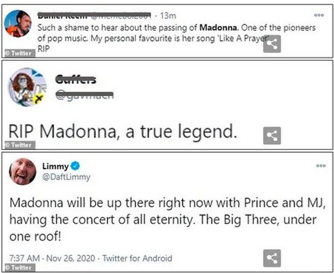 Ωστόσο, αν υπήρχε κάποιο βραβείο για την γκάφα της χρονιάς, τότε αυτό θα ανήκε δικαιωματικά σε Αυστραλούς. Συγκεκριμένα, σύμφωνα με το Sport24.gr, λόγω λάθους της αυτόματης διόρθωσης στο Twitter το όνομα Μαραντόνα έγινε… Μαντόνα, με αποτέλεσμα να πλημμυρίζει η πλατφόρμα με μηνύματα πένθους για την 62χρονη ποπ σταρ.