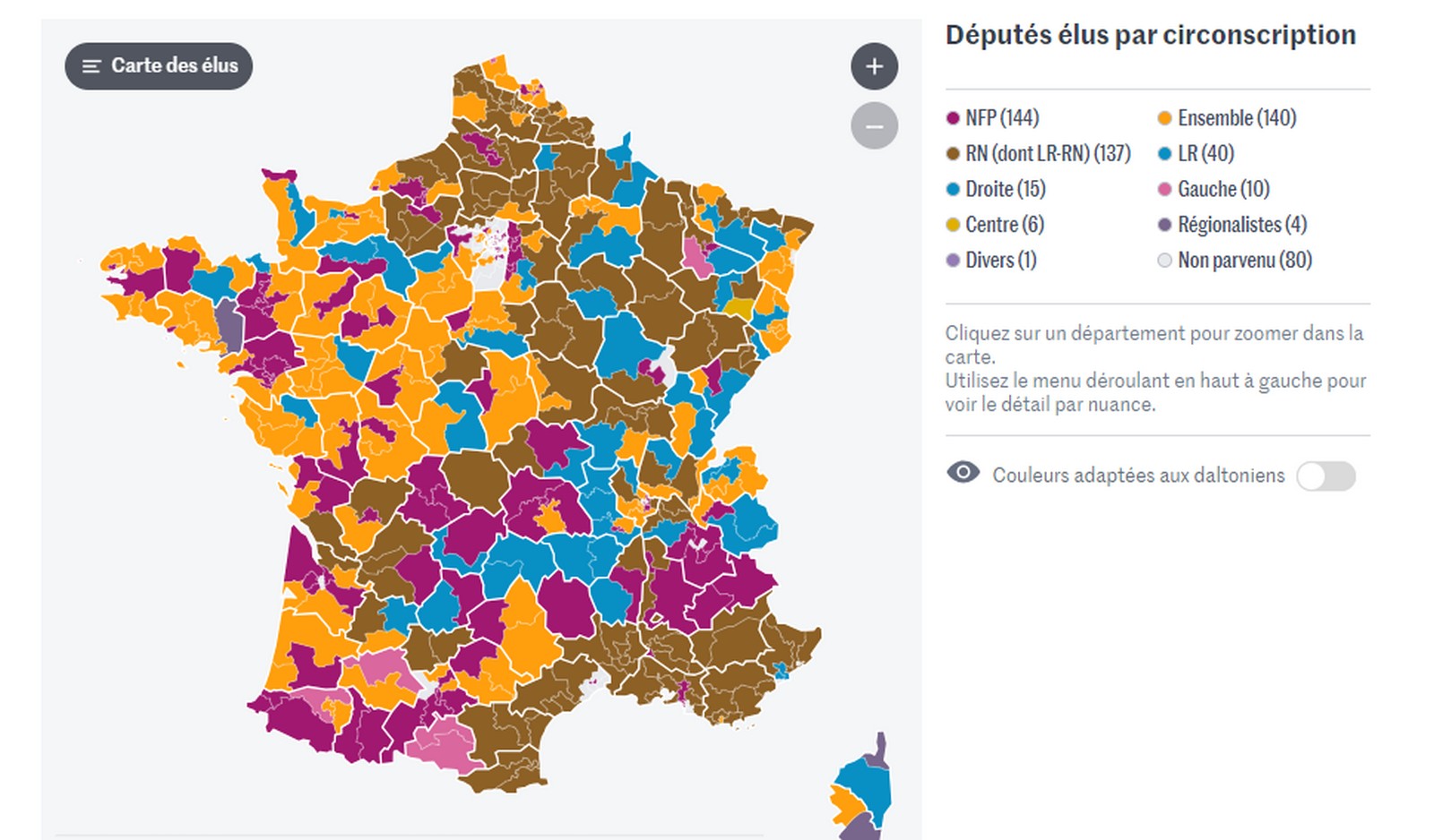 Όπως φαίνεται κανένα κόμμα δεν συγκεντρώνει την απόλυτη πλειοψηφία των 289 εδρών. Η γαλλική Εθνοσυνέλευση αποτελείται από 577 έδρες συνολικά.