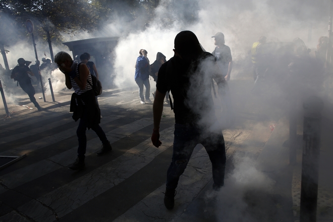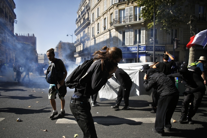 Στη λεωφόρο Saint-Michel, στην καρδιά του Παρισιού, οι ακροαριστεροί διαδηλωτές, ορισμένοι εκ των οποίων με τα πρόσωπά τους καλυμμένα, πέταξαν αντικείμενα εναντίον των δυνάμεων επιβολής του νόμου κι επιτέθηκαν εναντίον μιας τράπεζας.